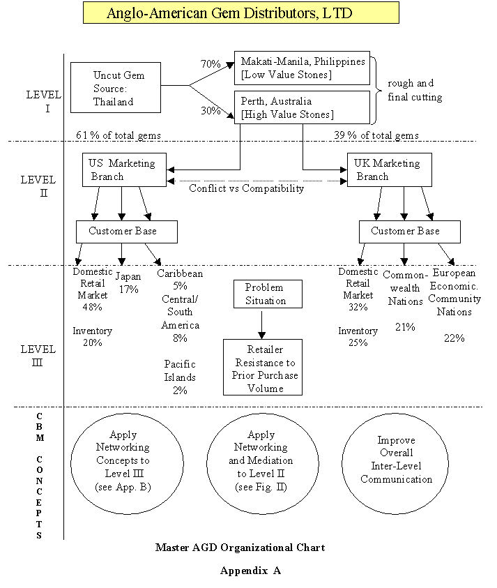 Level II of Appendix A displays the "trifurcated" nature of both the U.S. and U.K. customer bases of this firm. Relative percentages of product for each geographic sub-region are indicated. What cannot be portrayed, however, on this "master organizational chart" is the intensely critical problem developing in several major AGD markets, such as the two domestic sales areas, Japan and the EEC nations. Indeed, AGD figures demonstrate that gem sales seem to have reached a saturation point in both domestic markets, and have been decreasing slightly throughout the Pacific Rim and in Europe. Communication between AGD distribution representatives and retail jewelers has broken down. Once ever-expanding sales are now stagnating and jeweler resistance is developing, notably in Tokyo, Paris and Suburban Rome.