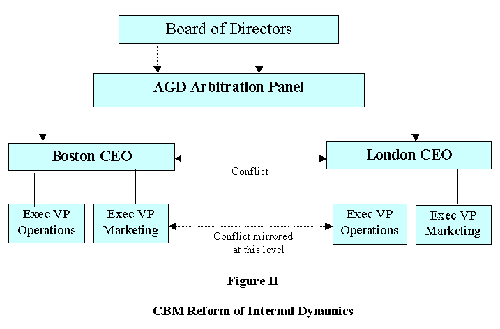 The Boston-London relationship paradigm can be simply described as an intra-corporate power based struggle in which each headquarters office is striving for control and dominance, geographically, financially, and strategically. The forceful individuals at the top of the personnel pyramid at each office must begin to collaborate in the overall interest of the firm. There must be urgent overhauling and restructuring of the decision-making authority base, perhaps through the neutral offices of a mutually acceptable ombudsman, heading an Arbitration Panel. Figure II, below, depicts how the present conflict-prone mentality might be effectively mediated and redressed.