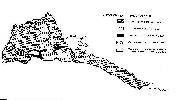 Almost 65% of the Eritrean population have been found to be at high risk of malaria. The recent war with Ethiopia has raised havoc in efforts to control the spread of this disease that has ravaged many other East African nations as well as Eritrea. Although Ministry of Health projects and programs have done much to eradicate vectors of this disease in many urban areas, the rural populations continue to be subjected to the high risk factors discussed in this analysis. WHO, USIS and other NGOs have attempted to supplement mosquito eradication programs, and have contributed to prophylaxis efforts, but the rise in malaria figures continues to point to a rather pessimistic future for Eritrea in its struggle against this serious condition. The nation’s economy is, of course, also linked to the incidence of malaria and, for this and humanitarian reasons, the Eritrean Government must redouble its efforts to combat the proliferation of P. falciparum and P. vivax in interior and coastal areas of the nation.