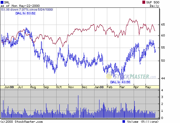 Secondly, Delta Air Lines, Inc. requires brief valuation analysis and commentary. On Appendix A, it can be seen that Delta share prices have fluctuated roughly between 43 and 63 dollars per share in the last year (June 99 to May 00). These shares are priced at approximately three times the value of Southwest’s. A current Delta share (DAL) is being sold at $55.19, according to Stock Master’s May 23rd quotation, inthe mid-range of this year’s performance.